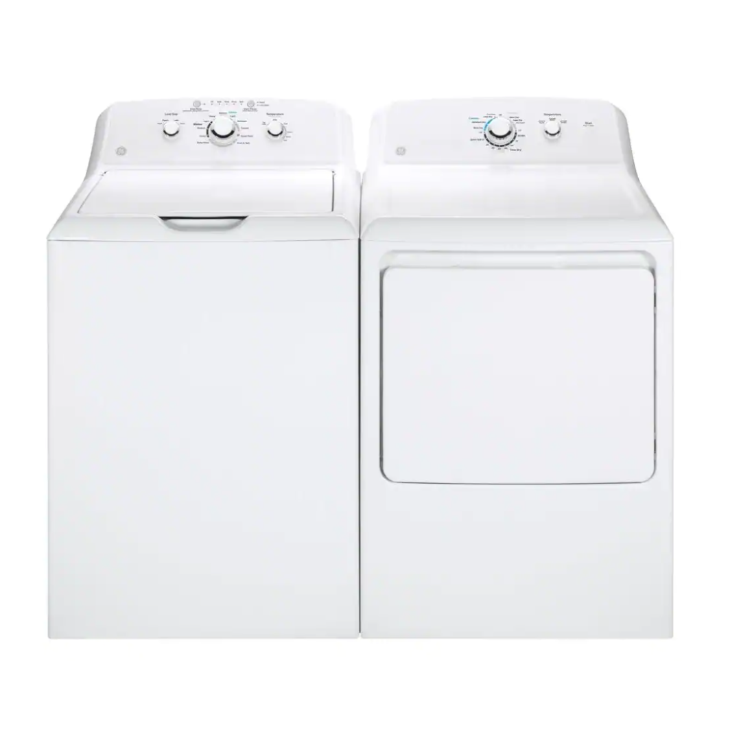 GE® White Laundry Pair with a 6.2 cu. ft. capacity front load electric dryer and a 4.0 cu. ft. capacity top load washer.Read More