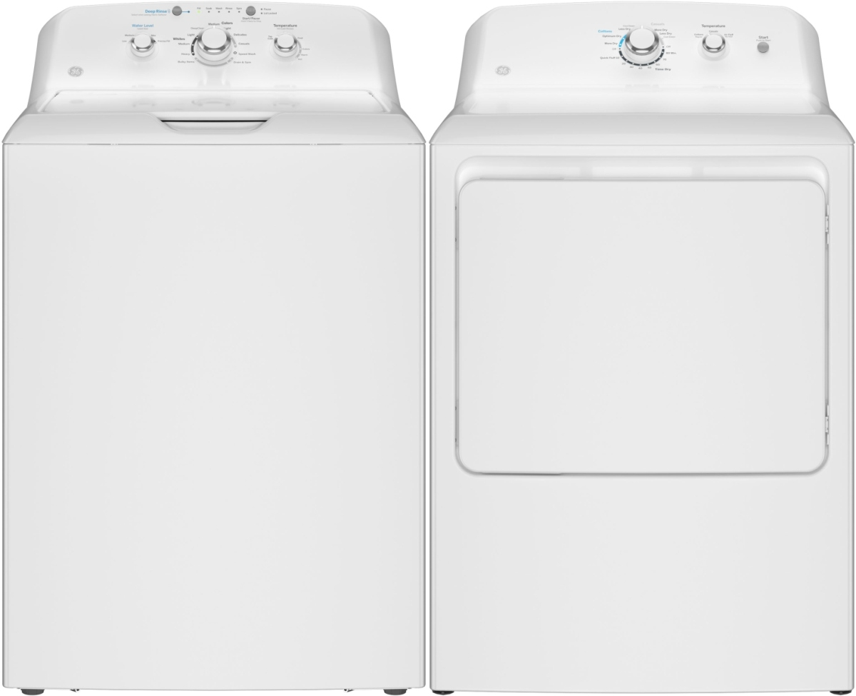 GE® White Laundry Pair with a 6.2 cu. ft. capacity front load electric dryer and a 4.0 cu. ft. capacity top load washer.Read More