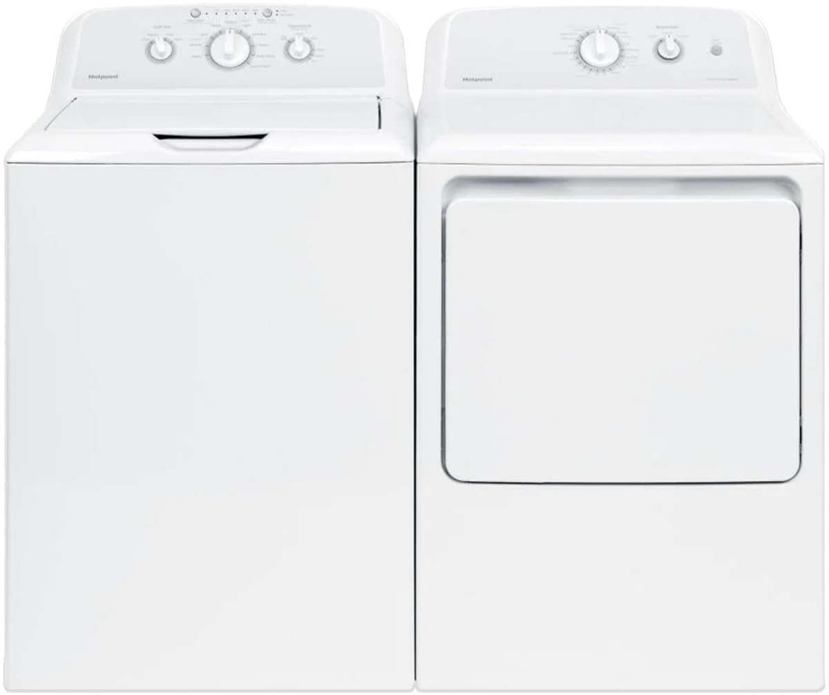 Hotpoint® White Laundry Pair with a 3.8 cu. ft. capacity top load washer and a 6.2 cu. ft. capacity front load electric dryer.Read More